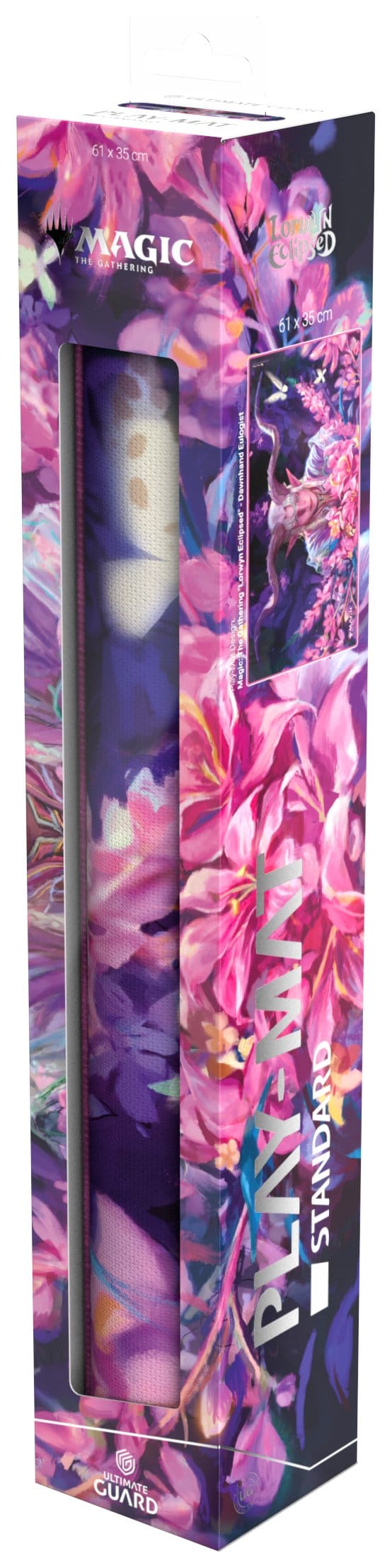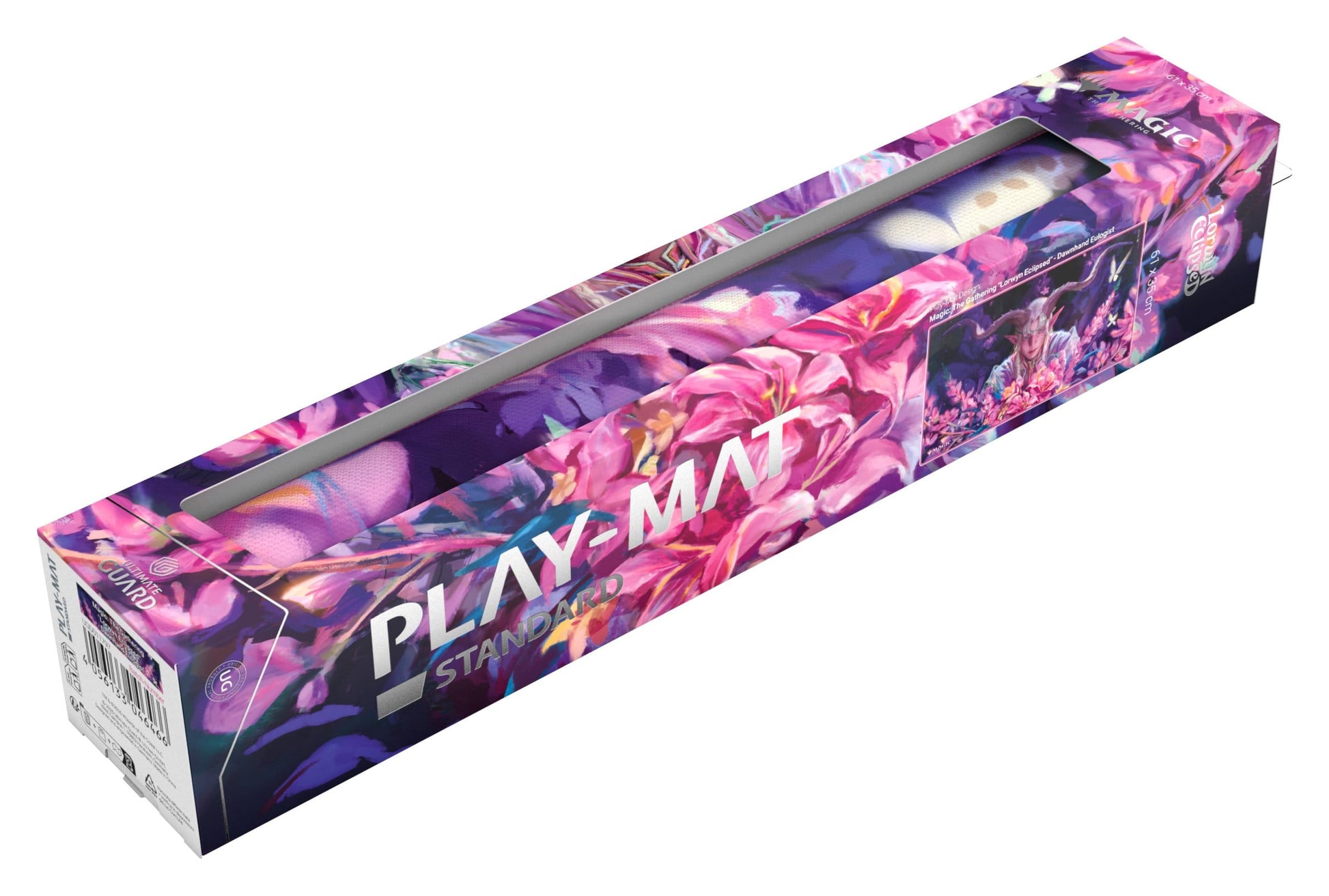 Ultimate Guard's Play-Mat Standard, featuring officially licensed artwork from Magic: The Gathering's "Lorwyn Eclipsed" set, is a high-quality, 61 x 35 cm MTG playmat that enhances the gaming experience and protects MTG cards, sleeves, and accessories from scratches, wear, and dirt. The 2 mm thick, soft-cushioned playmat is made from natural rubber and features Ultimate Guard's trusted anti-slip underside and a high-quality, soft fabric surface. The gaming mat's stitched edges prevent fraying and ensure long-lasting durability.